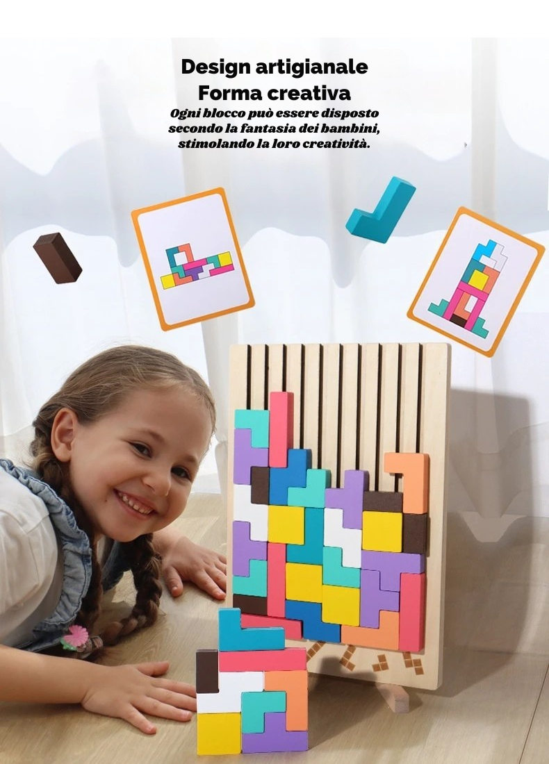Questo tipo di gioco ispirato al videogioco Tretis, è un rompicapo educativo che aiuta a sviluppare la logica, la concentrazione e la motricità fine. L'obbiettivo è incastrare i blocchi di forme diverse per completare le righe o riempire l'intera tavola. E' un alternativa tattile e tridimensionale al gioco elettronico, adatta sia a bambini che adulti. Il gioco è realizzato in legno ecologico e sicuro, stimola il pensiero critico e l'apprendimento attraverso il gioco.